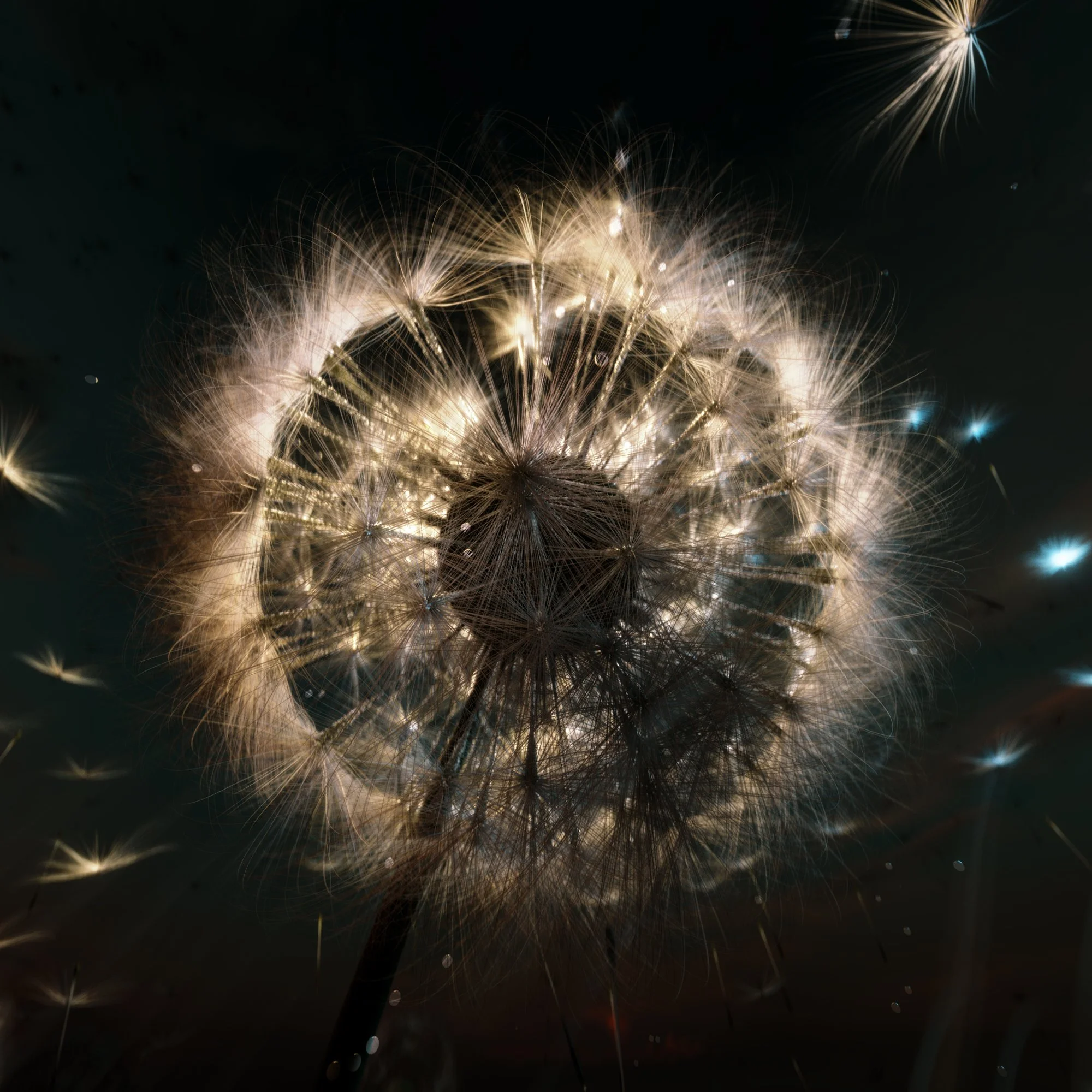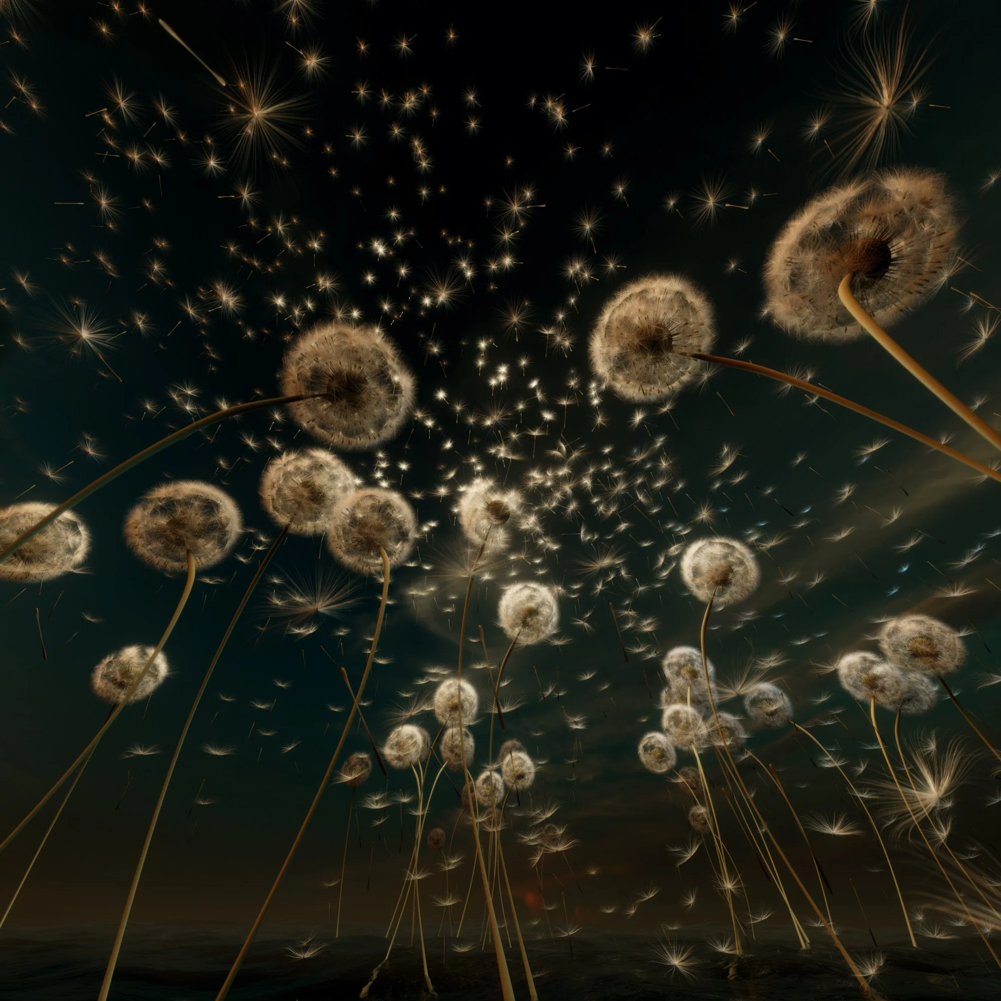 Through soft bokeh, a single dandelion sharpens into focus, its delicate seeds dancing on invisible currents. The camera pulls back, revealing countless dandelions reflected on dark, rippled water. As reflections dance across the surface, the dandelions blur and transform into glowing lanterns that begin to rise. In a wave moving toward the audience, these lights lift skyward, embodying the lyric "enjoy the ride." As the lanterns ascend into darkness, they shrink to starlight, their points of light organizing into swirling galactic structures. The camera tracks back through pulsing nebulae and cosmic formations, suggesting how quieting the mind expands our perspective from intimate earthly details to infinite universal rhythms, a journey from single seed to entire cosmos.