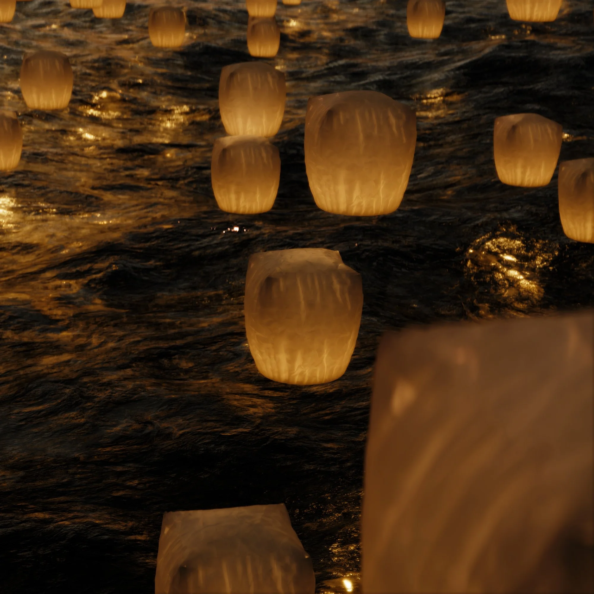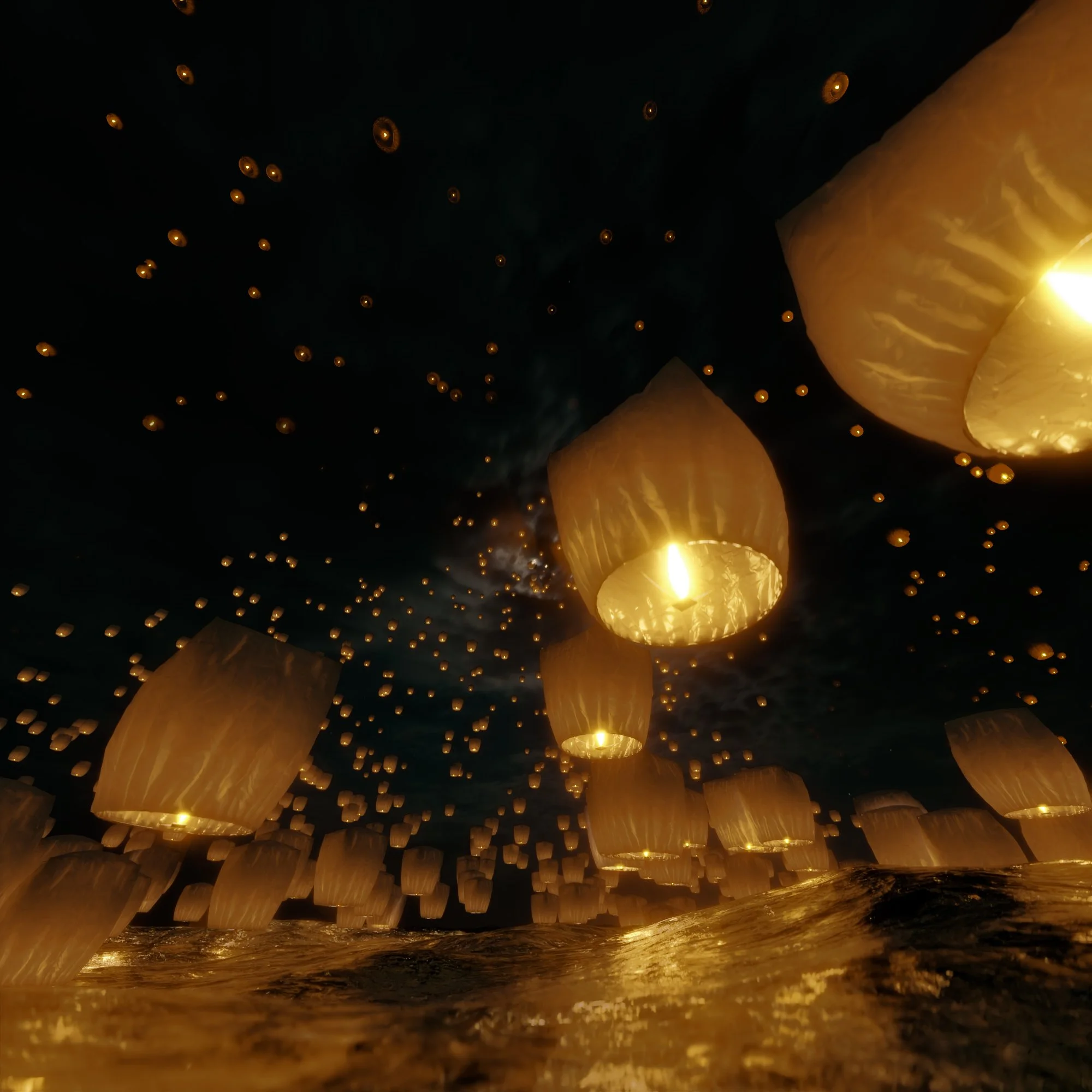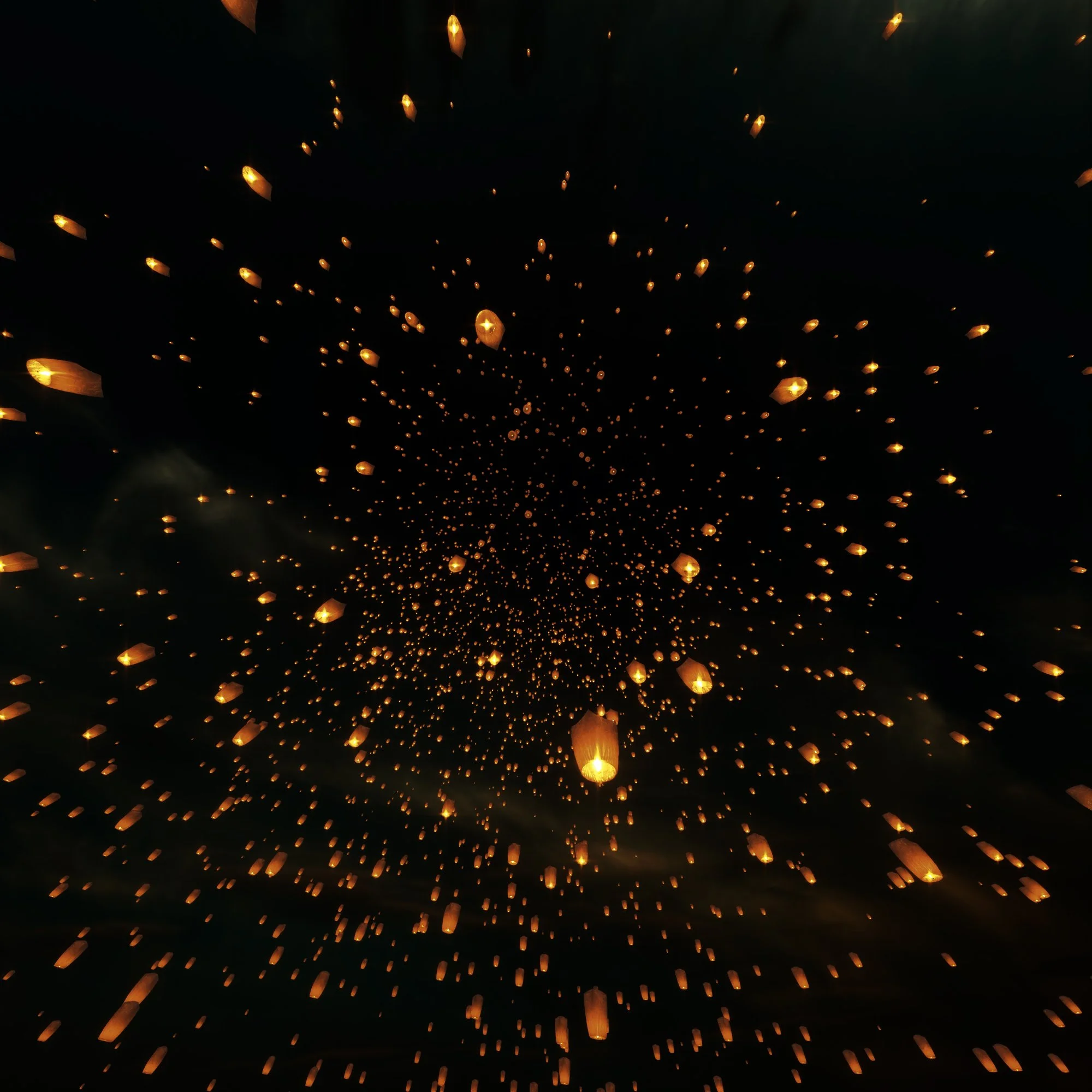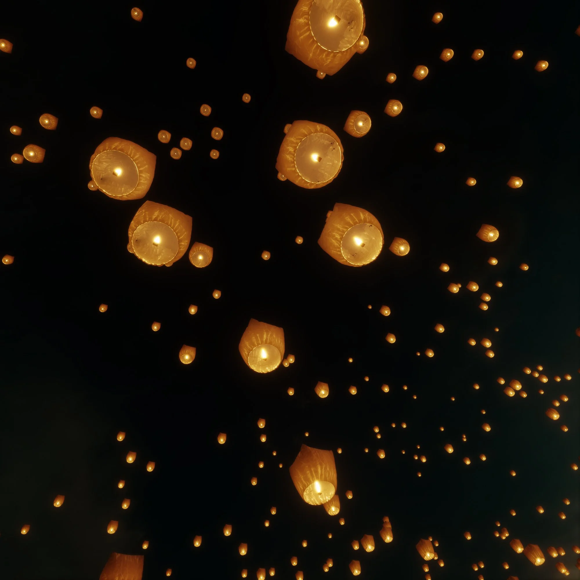 (RESOLUTION) (1:50-2:30) WE SEE BLURRY BOKEH, FAR IN THE DISTANCE, RISE INTO THE SKY IN A WAVE COMING TOWARD THE AUDIENCE. THE LANTERNS TAKE OFF AS THE LYRICS "ENJOY THE RIDE"