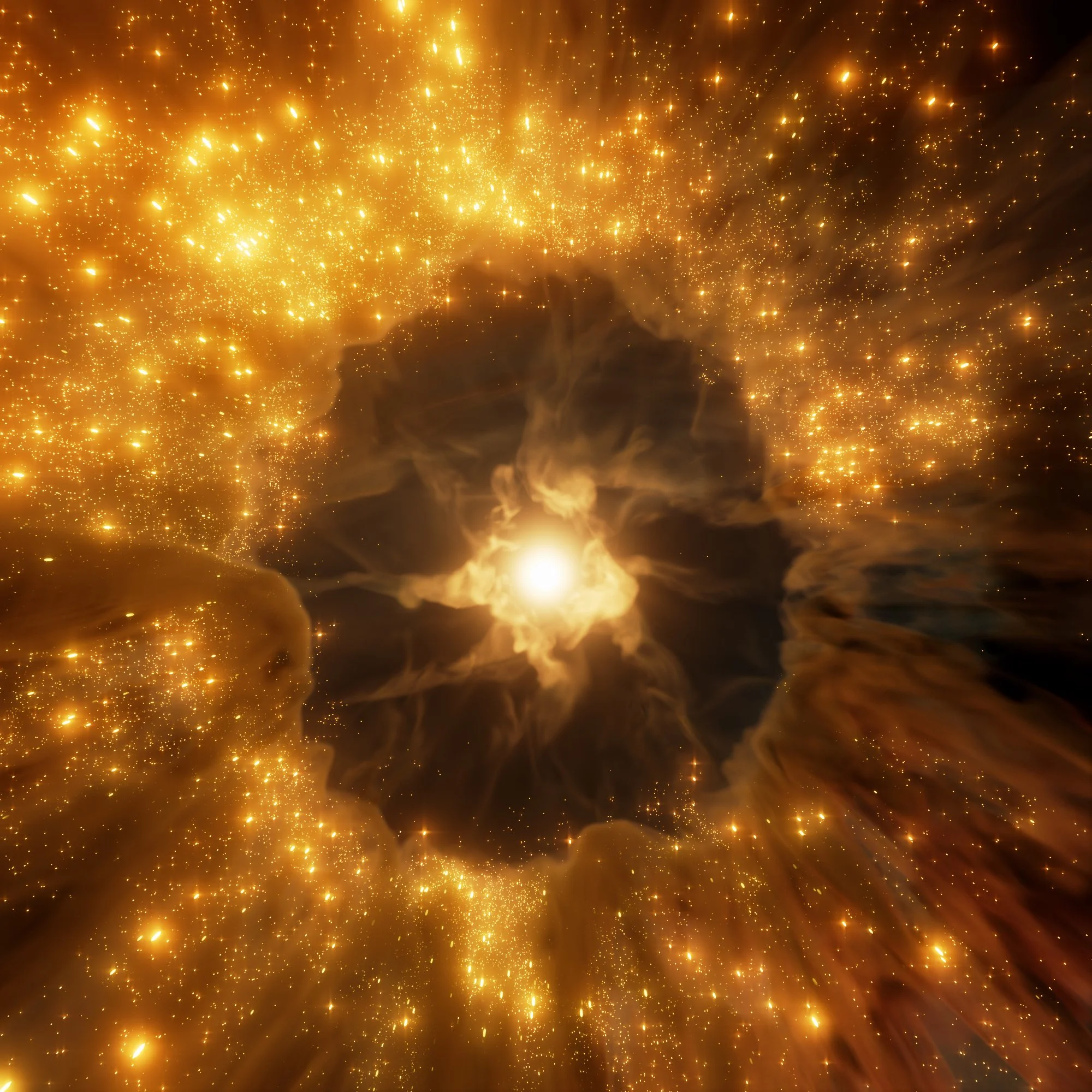 (CLIMAX) (2:51-3:08) POINTS OF LIGHT GLIMMER AND MOVE, ORGANIZING INTO ORGANIC GALACTIC STRUCTURES